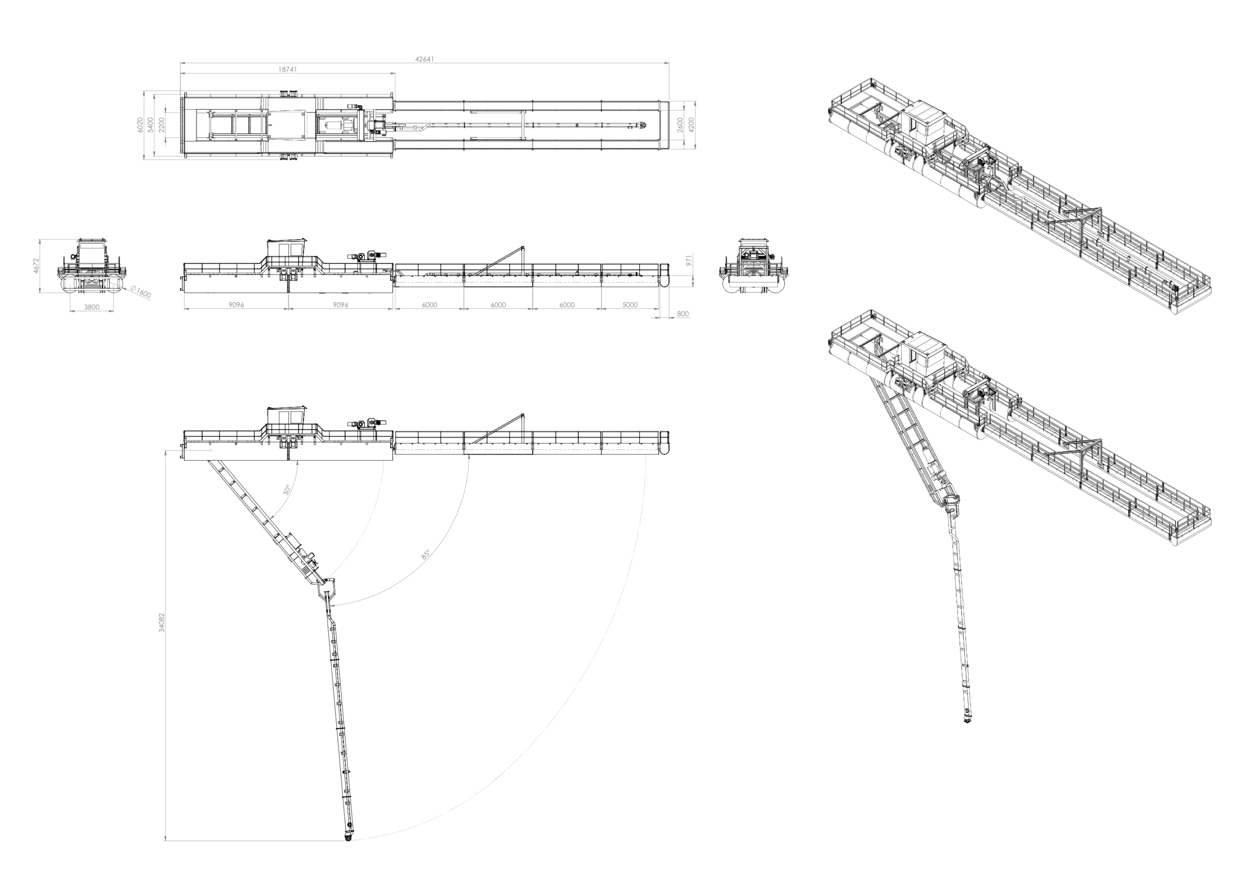 Nasza koparka brodząca pozwala na współpracę z pompami refulacyjnymi o wydajności do 1200m3/h a jednocześnie jej gabaryty pozwalają przewozić ją bez demontowania. Nie ma konieczności oddzielania nadwozia koparki od podwozia. Jest to jedyne rozwiązanie na rynku, które daje takie możliwości.