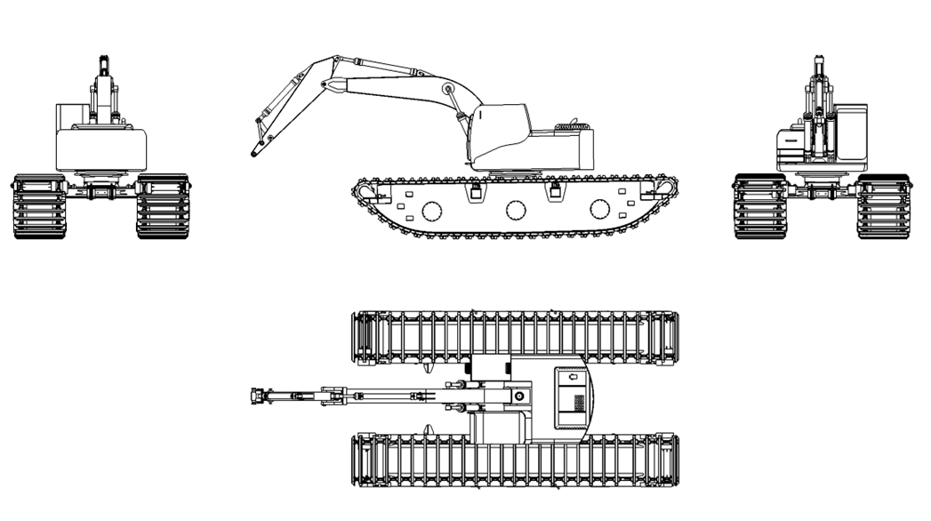 1. Podwozie gąsienicowe, wypornościowe, składające się z lewej i prawej gąsienicy. Obie gąsienice połączone łącznikiem z mechanizmem teleskopowym, który umożliwi rozszerzanie rozstawu gąsienic na czas pracy i zwężanie na czas transportu. Do łącznika montowane jest nadwozie – wieża koparki.