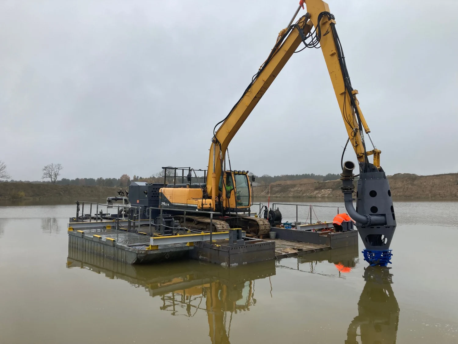 Na platformach do robót hydrotecznicznych ustawiamy koparkę gąsienicową. Możemy nią wykonywać pogłębianie za pomocą łyżki. Mamy także możliwość zamontowania w miejsce łyżki pompy refulacyjnej SDP i wówczas zestaw spełnia funkcję pogłębiarki ssąco-refulującej. Tak skonfigurowana pogłębiarka jest bardziej przydatna na budowach, gdzie występują w dnie korzenie drzew lub wówczas, gdy zbiornik jest częściowo zarośnięty roślinnością. Refulacja pompą zamontowaną na ramieniu koparki pozwala wypompować piasek spod warstwy rosnących trzcin. Natomiast fakt, że na zestawie ustawiona jest koparka, pozwala w razie potrzeby na przezbrojenie jej z pompy refulacyjnej ponownie w łyżkę i usunięcie z dna przeszkód takich jak pnie drzew czy stare korzenie drzew.